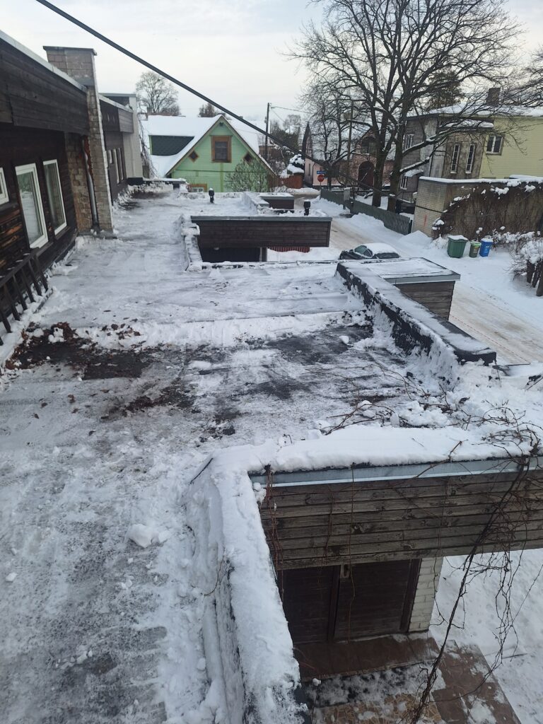 Lükkame lund katustelt ning eemaldame jääpurikaid, ka eemaldame lume terassidelt ja rõdudelt. Kui sulavesi pressib tuppa ja katus lekib, siis meie käest saad tellida ka katuse remondi. Kui jää on juba lõhkunud vihmaveerenne, siis ka need teeme korda.
